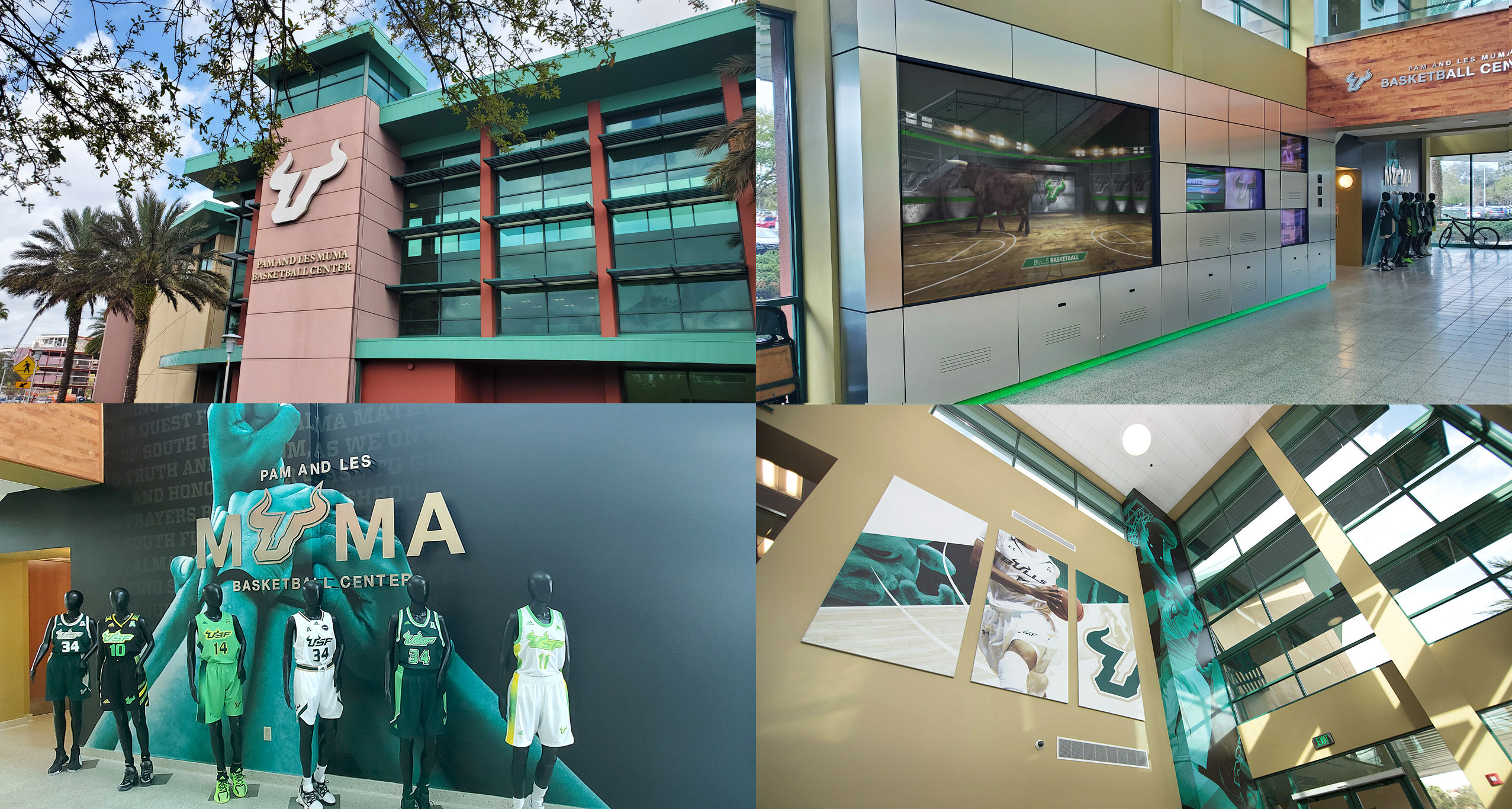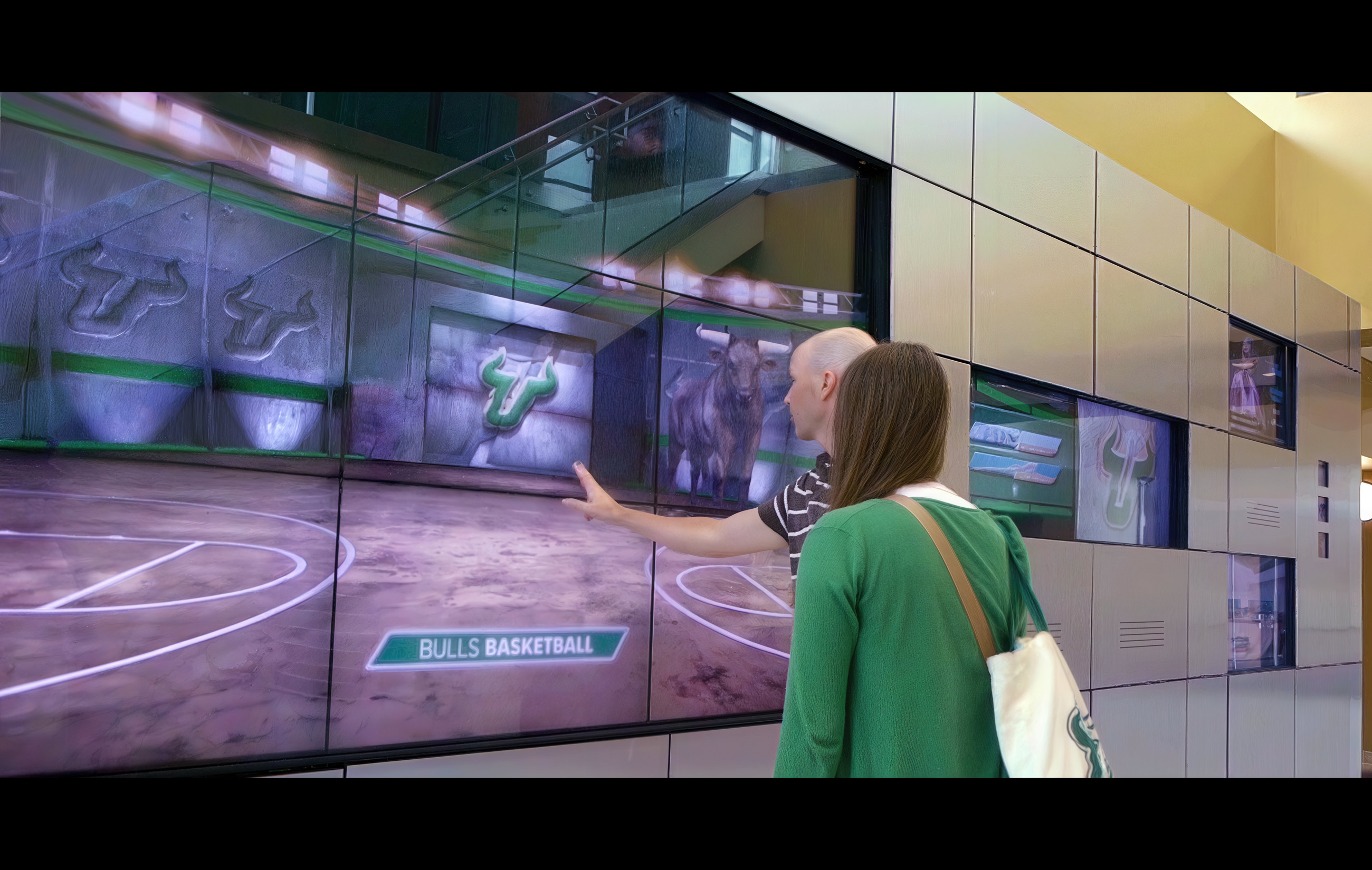 The newly built interactive wall, which totaled 30 feet in length and 10 feet in height, was a crowning success in celebration of the newly built USF Athletics Center. Being a huge buzz on campus, students flocked to interact with the wall. A lot of them were eerily surprised on how the bull would stare and track them as they walked around and toward the screen. The USF athletics director and staff were all blown away with overall design, animation, and abilities of the wall on how it showcased all of the areas they were hoping for. The final product delivered a high-level of immersive impact, educated new students about the Athletics department, and helped to foster the thematic message of success in the classroom, community, sports, and life.