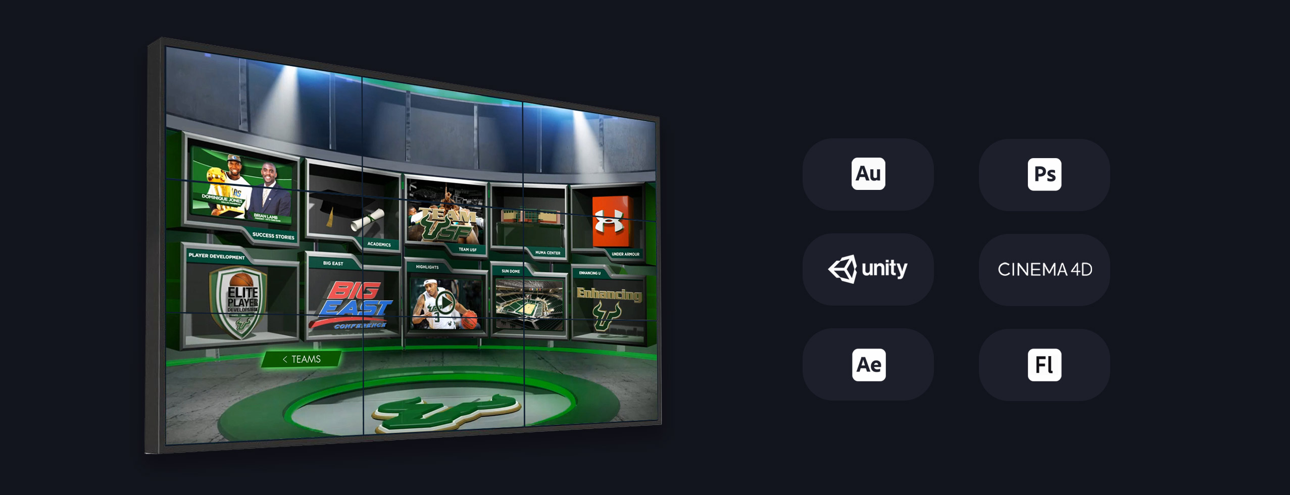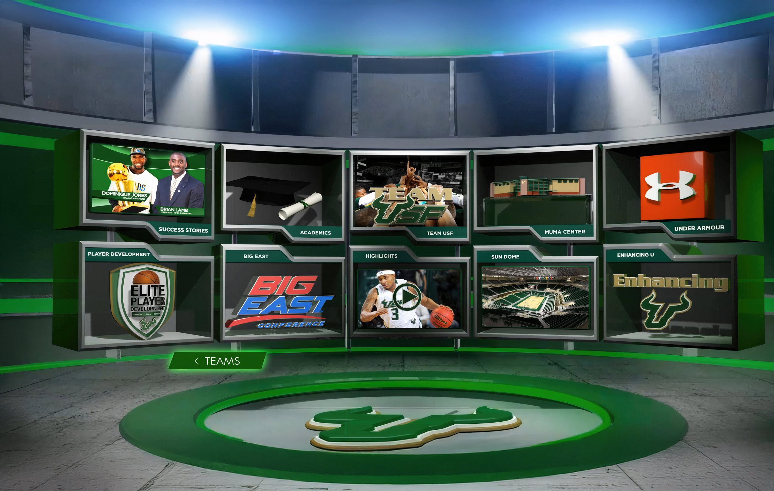 The initial brief contained a unique challenge to create a 9 foot tall by 12 foot wide interactive touch screen for the University of South Florida Bulls Athletics Department. To achieve success, the following goals were required: